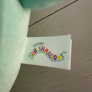 This Squishmallows cat plush toy features a soft mint green body with charming pink accents. Its round, pillow-like shape and embroidered facial features give it a sweet and cuddly appearance. The pink heart-shaped accessories add a delightful touch to its kawaii design.