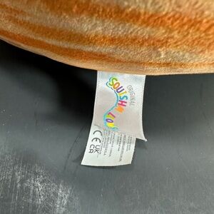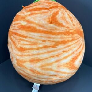 Soft orange Squishmallows plush with charming stripes. Ideal for cozy decor.