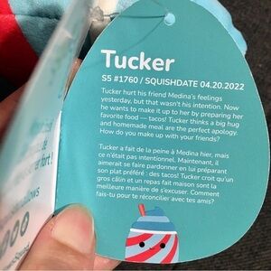 Tucker the Slushie is a blue and red squashmallow from the Food Squad, with red straw poking out from his left side. He has round, black eye, and a smiling mouth.