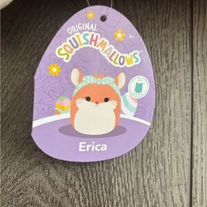 Adorable plush toy with orange and white colors. Features a cute face and a blue bow.