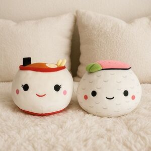 Adorable Squishmallows Flip-A-Mallows featuring Raisy the Ramen Bowl and Shun the Sushi Roll – two plushies in one!