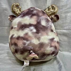 The Squishmallows GREGGOR is a 14" brown-white moose stuffed animal with a fuzzy tummy pattern and tag. His gold metallic ears are super cute! This medium-sized plush toy from the Squishmallows brand is perfect for any occasion and is made in China. With its adorable design and high-quality construction, this stuffed animal is sure to bring joy to children and collectors alike.