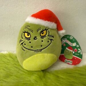 Adorable Squishmallows Grinch in festive Santa hat. Great for holiday fun.