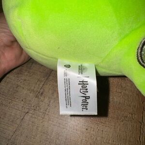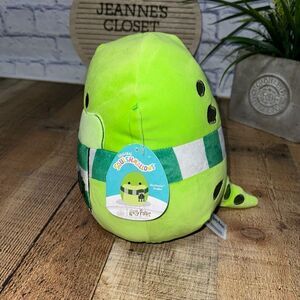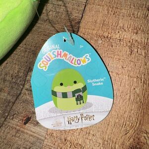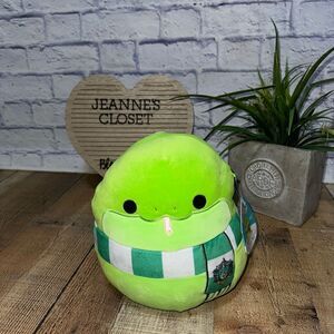 Squishmallows have a new line of Harry Potter Hogwarts House plushes. Each is wearing a scarf from a house at Hogwarts. This listing is for one Slytherin Snake Squishmallow plush toy. This is a green snake wearing a scarf from Slytherin. This item is new with tags.