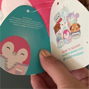 NWT 10" Squishmallows Kavya the Penguin Kavya is a hot pink penguin with a white front. They have closed, happy eyes and a sparkly silver beak. They wear a colorblock shirt which has baby blue and baby pink panels. The shirt's collar is lilac and laced up with white string, and the pocket on the right side is also lilac with white stripes. SQUISHDATE: 06.28.2021 Meet Kavya. This peppy penguin is a team player who is always willing to lend a hand. Kavya believes that being kind and thinking of others are the best ways to live.