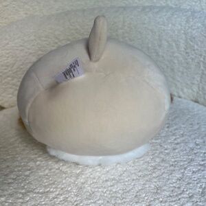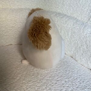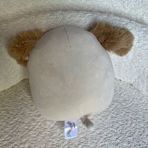 Meggie is a light tan maltipoo dog breed which is a mix of a maltese and a poodle. She has light brown, floppy ears and a rounded, white belly which are both fuzzy. She has a white muzzle, round, black eyes, and a black nose and mouth with her pink toungue sticking out.