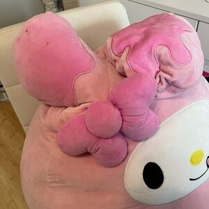 Adorable pink Squishmallows stuffed animal. Features cute face and bow. Soft and cuddly. Used super big size