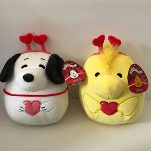 YOU ARE PURCHASING A BRAND NEW WITH TAGS 2023 VALENTINE'S DAY-THEMED SQUISHMALLOWS 'SNOOPY' & 'WOODSTOCK' PLUSH / STUFFED ANIMALS SET. MEASURE APPROXIMATELY 8.5" HIGH / 8" WIDE / 4.5" DEEP. VERY SOFT! COMES FROM A PET-FREE, SMOKE-FREE ENVIRONMENT.