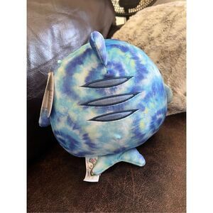Luther is a shark with a ringed tie-dye pattern that is mostly blue with fragments of yellow-green. He has three fins, two on each side and one atop his head. He has a round, white belly. He has round black eyes and a small smile, as well as gills on each side of his body.