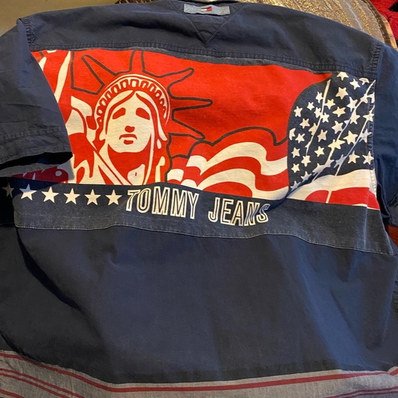 Tommy Hilfiger with Statue of Liberty and American flag on back. Front grey strips and red. EUC. Pet, smoke and RonaFree. Thanks for checking our closet.