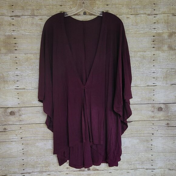 Excellent used condition. This pretty shawl can be worn many different ways. It features fixed sleeves, side slits, a small button front closure and has lots of stretch. It's made of 98% Rayon and 4% Spandex and was made in India by a fair-trade company. It measures 37.5 inches from the back neck to the hem.
