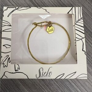 Add a meaningful touch to your accessory game with this gorgeous brass bangle bracelet from Sseko Designs. Crafted with a minimalist twisted hook design and finished with a stamped hexagon charm engraved with “Sseko,” this piece is simple yet striking.