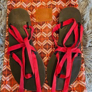 *1 pair Ribbon Sandals, brown base. Size 7. Very lightly worn. Original Price $58. This is Sseko's 1st product when the company was created. Comes with 6 different ribbons (Original cost $96 for all 6) and a carrying bag. 2 of the ribbons match the 2 split seem Blouses in the Sseko Clothing Lot I have for sale. These sandals can be strung many different ways to create multiple, unique sandals. Google Sseko Ribbon