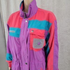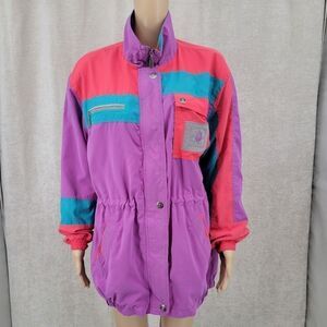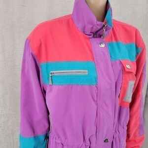 Pink, Purple and Teal Color block 80s jacket, looks like a ski jacket but is lighter weight. Adjustable waist. Full zip and snap closure. No stains or excessive wear.