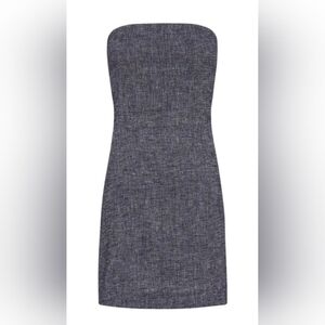 Tailored fit, bandeau neckline, lined bodice, boning at side seams, mini hem dress, zip fastening at back.
