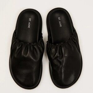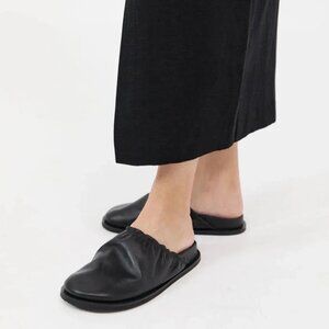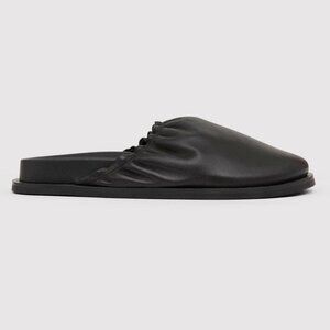 Flat-based silhouette, gathered leather upper detail, slide on design