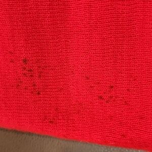 Vibrant red and blue beanie with pom-pom. Features St. Andrews logo. Small marks as noted in photos (majority covered when cuffed). No fabric or branding tag.