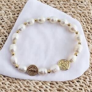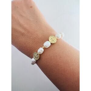 St Benito bracelet made of freshwater pearls and gold plated beads