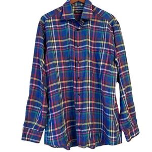 St Croix Men’s 100% Italian linen blue yellow plaid long sleeve button down Sz L