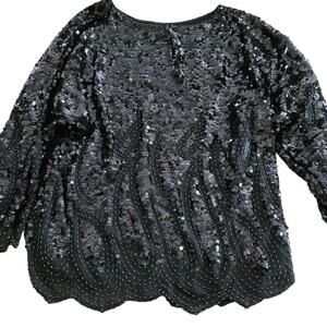 St. Eve Milano Black Long Sleeve Subtle Iridescent Sequin Beaded Scallop Hem Top
