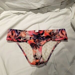 St. Even bikini set. Top is a size 34, with triangle cups and self-tie halter top. Botton size M has a cheeky hipster fit with a ruched front. Printed with a sunset background of pink, oranges and purples with Palm trees swaying in the breeze. Lined with geometric heart print.