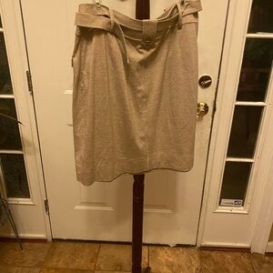 Well made casual skirt, lunch date, walk around town. This skirt is tan in color with 2 functional pockets in front that are adorned with royal crest buttons. Has detachable belt with St. John logo imprinted on buckle. Smal metal logo okay on left near waistline. Measurements are taken lying flat non-stretched