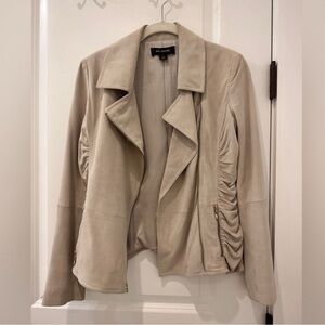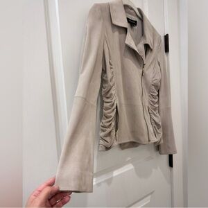 St. John 100% Lamb Suede Beige Jacket Silk Lined Ruched Sleeve Detail Size 2