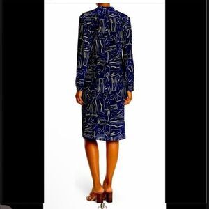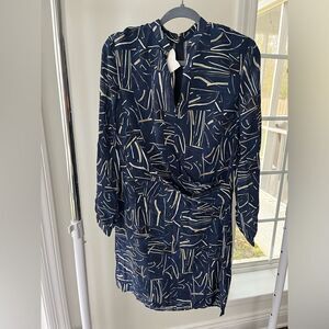 St. John 100% Silk Long Sleeve Faux Wrap Mini Dress, Artistic Pattern Blue S NWT