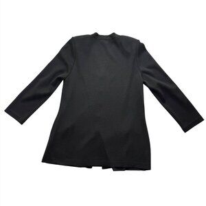 This St. John Basics cardigan jacket offers a sophisticated touch to any wardrobe with its elegant black knit fabric and decorative buttons. Its timeless design and quality craftsmanship make it a versatile piece for professional settings. It is in excellent preowned condition without flaws or undue wear. A listed size 12.