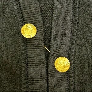 • Features: Gold-tone crest buttons, faux front pockets, open front design