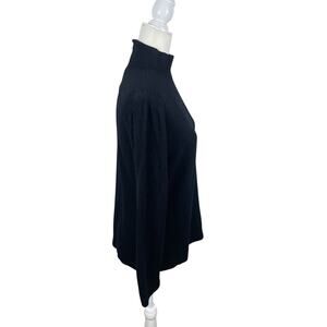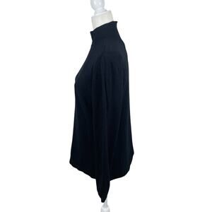 Mock neck with a contrasting stitching at top. Back zipper, long sleeves. Black. Size large. Please see photos for measurements.