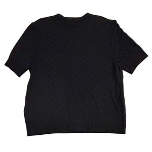 Timeless elegance meets modern polish in this St. John Basics short sleeve cardigan. Made in classic black with a subtle quilted knit texture, this button-front sweater features gold-tone crest buttons for that signature St. John sophistication. A versatile piece perfect for work, evening, or layering.