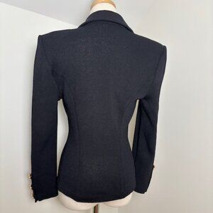 This is a St. John Basics jacket in black Santana material that has no pulls, holes, rips, or stains that I can see. The sleeves each have 3 buttons on them, and each buttonhole is finished, as you can see in one of the photos. This jacket still has shoulder pads, but they can be removed. Dry clean only recommended. Size is a US 6. Measurements: