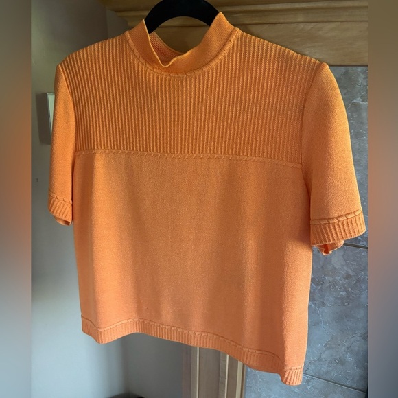 A Vibrant creamy orange knit top with short sleeves. Zippers at left shoulder. EUC. Features a ribbed upper section and a mock neck. Just a beautiful color to wear with white pants or jeans all year long!
