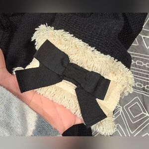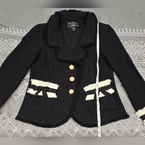 Great condition. Size 8. Runs small. Black and white. Tweed blazer. Fringe and bow details on pockets and cuffs. Fringe on collar, down buttons and hem. Pearl like and gold buttons. Measurements and fabric content listed above in pictures.