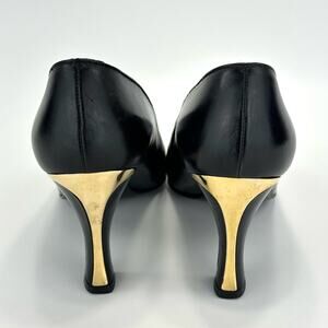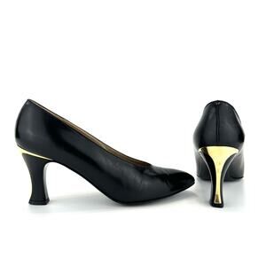 🪲 St. John Black Classic Pumps Size 8 Leather Comfort Heel Almond Closed-Toe Gold Heel Accent.