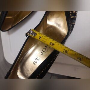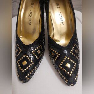 Step into elegance with these St. John heels, featuring a striking black and gold design. The intricate beadwork adds a touch of sophistication to the classic pointed toe silhouette, making them perfect for formal occasions. Crafted with attention to detail, these heels offer both style and comfort.