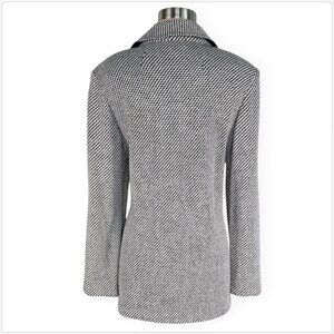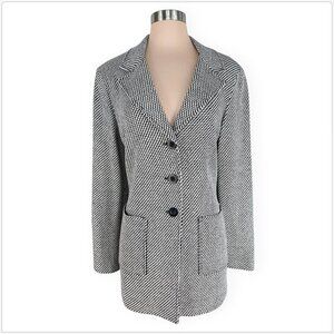 Beautiful black and ivory or cream white chevon patterned jacket with 3 button closure and 2 large front pockets. Novelty sweater knit fabric. Nice longer length.