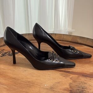 St John | Black Leather Bow Made In Italy NWOT Pointed Closed Toe Heels 7B