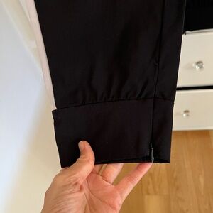 Sleek and sporty pull on pants from St. John featuring white side steps, tapered legs, and functional ankle zippers for an adjustable fit. Made from a luxe stretch nylon blend for a flattering, comfortable silhouette.