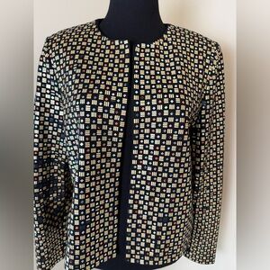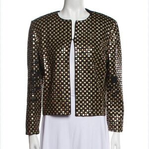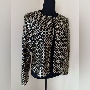 Elegant checkered blazer. Features black and gold pattern. Open front design. Long sleeves.