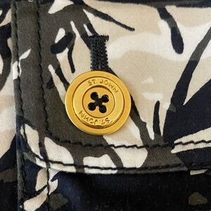 St John Yellow Label black, tan, cream and white leaf print floral full zip jacket. Fold down collar. Size 4. Excellent condition. 95% cotton 2% spandex. (I)