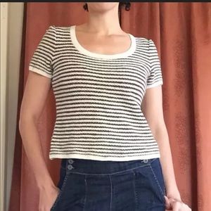 Chic black and white striped tee. Features short sleeves and scoop neckline. Perfect for casual wear.