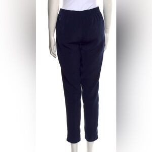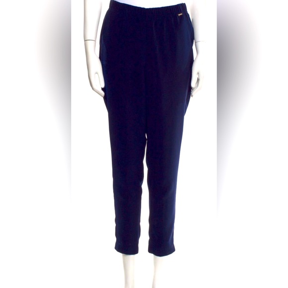 2 front pockets. St. John logo on front. Elastic waist. 100% polyester. St. John pants feature a deep navy blue color and a straight leg design, making them suitable for formal or business attire. The ankle cropped length adds a modern touch, while the smooth fabric and visible creases enhance their sophisticated look.