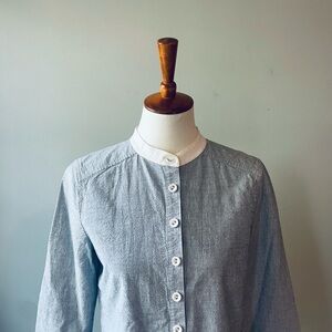 Elegant button down shirt by St. John. Features a classic blue and white stripe. Perfect for any occasion. Seersucker style with white trim collar. In excellent condition, such excellent quality!