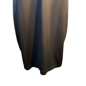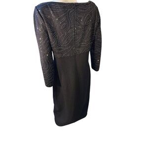 This St. John elegant black bodycon dress features a flattering V-neckline, 3/4 sleeves, and a rhinestone-embellished top for a sophisticated touch. Its sleek design and comfortable fit make it an ideal choice for formal gatherings or professional events, combining style with understated glamour.