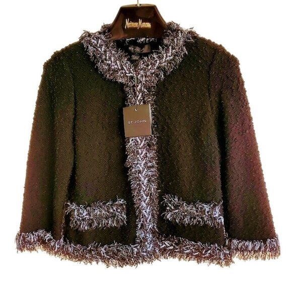 St. John Bouclé Jacket Caviar Frost Size 2 Fringe Trim NWT Couture