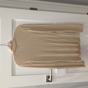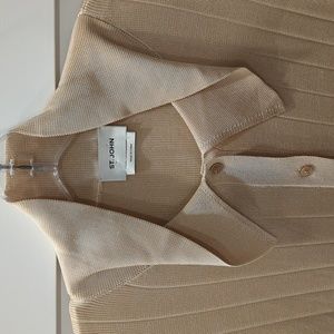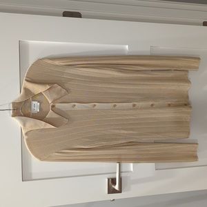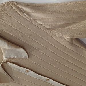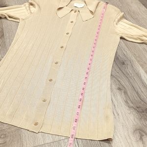 Button Front collared ribbed knit top. No flaws and it's in excellent condition. PTP stretches up to 23" (stretchable material). Oatmeal color to my eyes. Measurements are provided for your reference. Ask questions!