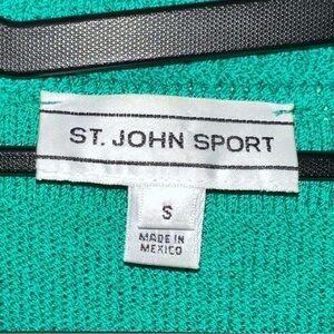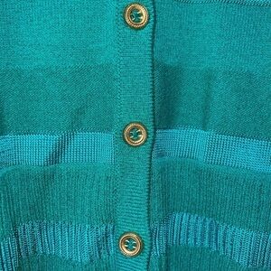 St. John Sport brand cardigan sweater. Size small. Wool & Rayon. Striped pattern. Blue & green / teal. Button front. Collared. Gold hardware. Stretch material. Vintage style. Dress up or down. Preloved. Please see all photos for condition.