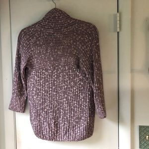 St John shawl collar open front cardigan....3/4 sleeves....color is a gray lavender tone...viscose....chunky ribbed knit...heavy quality construction...marked size P on the tag...see all measurements 17" pit to pit and 24" center back length